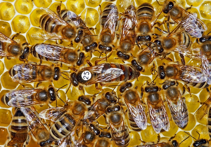 | Bienenkönigin aus dem Jahr 2011 beim Eiablage mit Hofstaat. EIn Flügel der Königin ist beschnitten, um das Schwärmen des Volkes zu verhindern. | ||